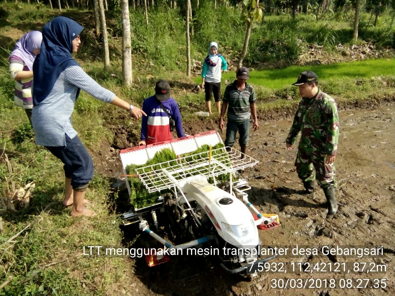 Tampak Bati Tuud Koramil 0815/15 Jatirejo Pelda Khudori Ardi dibantu Babinsa Gebangsari Serma Bahrudin Yuslam, dan Serka Agus Sunaryo bersama PPL Desa Gebangsari Siti Fatimah, dibantu Jumrotun Nisa, dan Mulyono PPL dari BPP Kecamatan Jatirejo, turun langsung dalam kegiatan tanam padi menggunakan satu unit Rice Transplanter.
