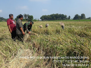 Kali ini, Babinsa Koramil 0815/16 Pacet Serma Agung Subagyo, yang melaksanakan pendampingan panen padi di areal persawahan seluas 6.000 M2 dengan jenis padi varietas Mamberamo, milik Suwaji, Dusun Randegan, Desa Warugunung, Kecamatan Pacet, Kabupaten Mojokerto, Jawa Timur , Senin (16/04/2108).