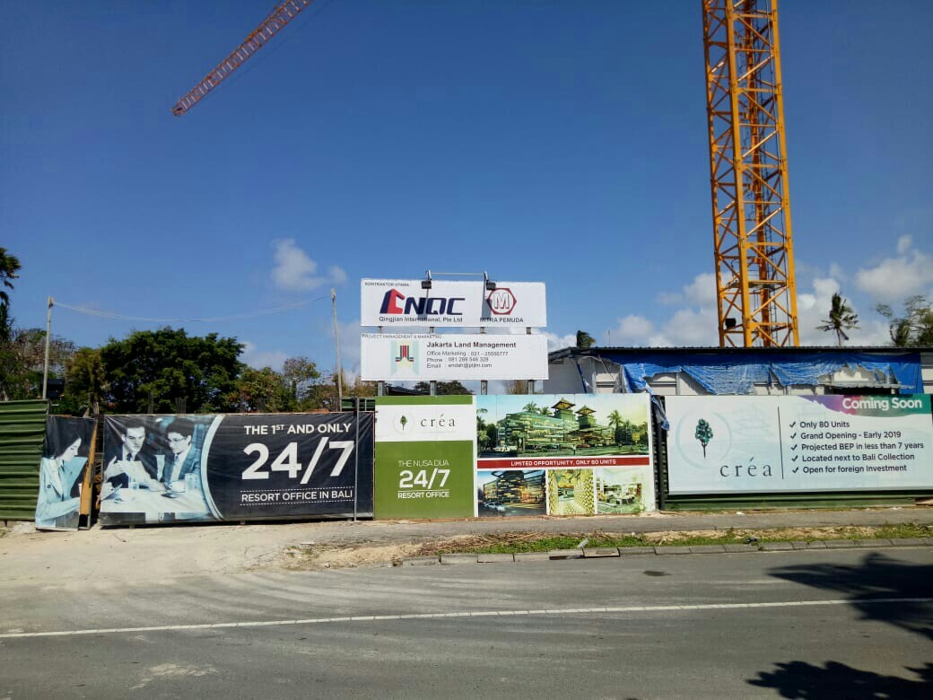Pembangunan gedug Crea Resort yang diduga bodong, di wilayah Nusa Dua, Kecamatan Kuta Selatan, Kabupaten Badung, Bali, proses pengerjaannya hingga saat ini masih terus berjalan.