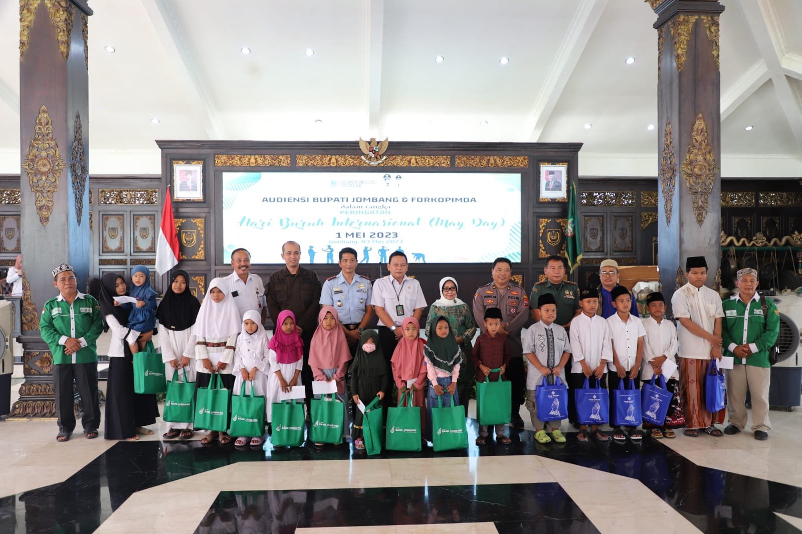 May Day 2023 di Kabupaten Jombang yang berbalut suasana Idul Fitri diperingati dengan penuh rasa syukur dengan memperkuat silaturahmi dan ditandai dengan santunan anak yatim, juga potong tumpeng oleh Bupati Jombang. Seluruh meja tamu disediakan masing masing satu tumpeng dan dinikmati bersama sama.