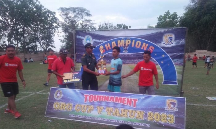 Jombang,sekilasmedia.com-Babinsa Koramil 0814-15/Mojowarno,Kodim 0814/Jombang Serma Soekadi melaksanakan kegiatan membantu pengamanan pada turnamen sepak bola piala GRG Cup ke V th 2023 di lapangan sepak bola dsn grogolan yang di selenggarakan oleh karang dsn Grogolan Ds Rejoslamet , Kecamatan Mojowarno, Kabupaten Jombang, Senin (28/08/2023).