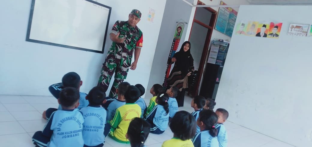 Jombang,sekilasmedia.com- Babinsa Pojokkulon Koramil 0814/12 Kesamben Kopka Gaguk Mariono dalam kegiatan Babinsa masuk sekolahan melakukan kegiatan mengajar di hadapan sekitar 20 anak anak TK Roudhotul Jannah Desa Pojokkulon Kecamatan Kesamben,Senin (16/10/2023).
