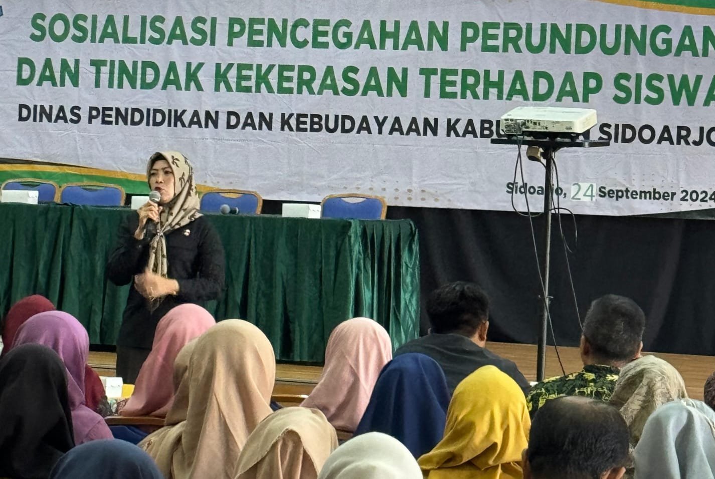 Sidoarjo ,Sekilasmedia.com-Dihadapan guru-guru SMP Se-Kabupaten Sidoarjo, Kanit Pelayanan Perempuan dan Anak (PPA) Satreskrim Polresta Sidoarjo Iptu Utun Utami mengajak peran bersama mencegah perundungan dan kekerasan di kalangan pelajar.