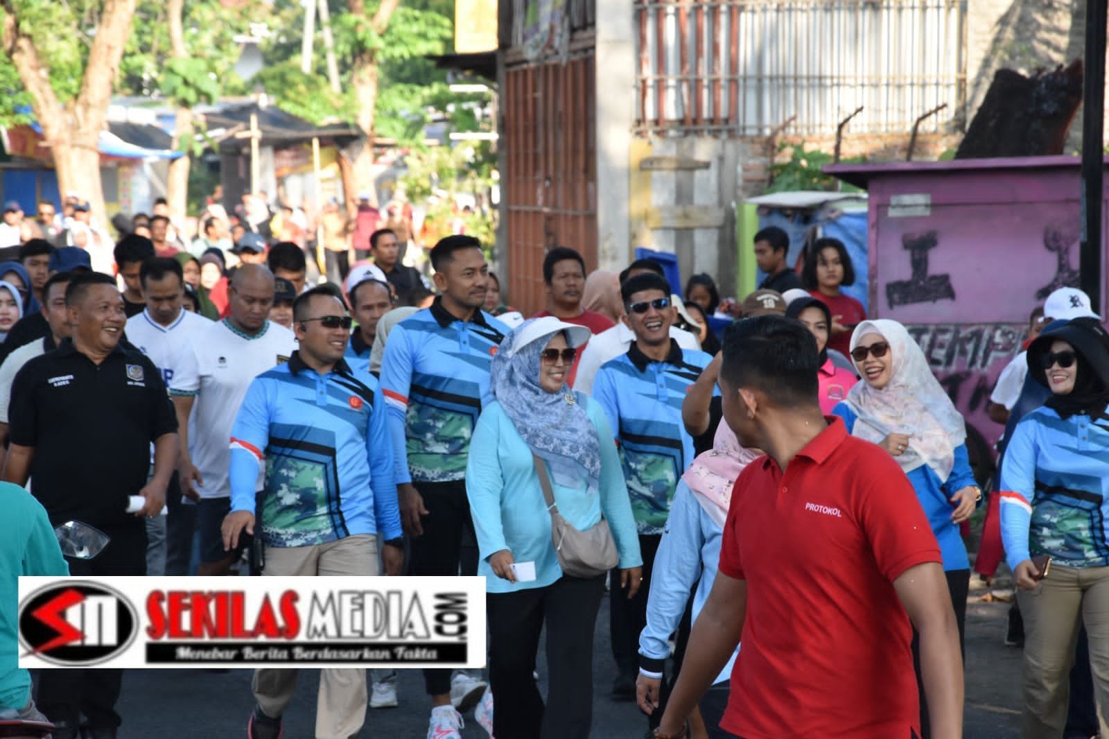 Tampak Dandim 0716/Demak, Letkol Arm Dony Romansah, Bupati Demak, dr. Hj. Esti'anah, S.E., dan Kapolres Demak, AKBP Ari Cahya Nugraha, berbaur dengan warga ikuti Jalan Santai Peringatan HUT ke-80 TNI.(Foto : Dwi Saptono - sekilasmedia.com)