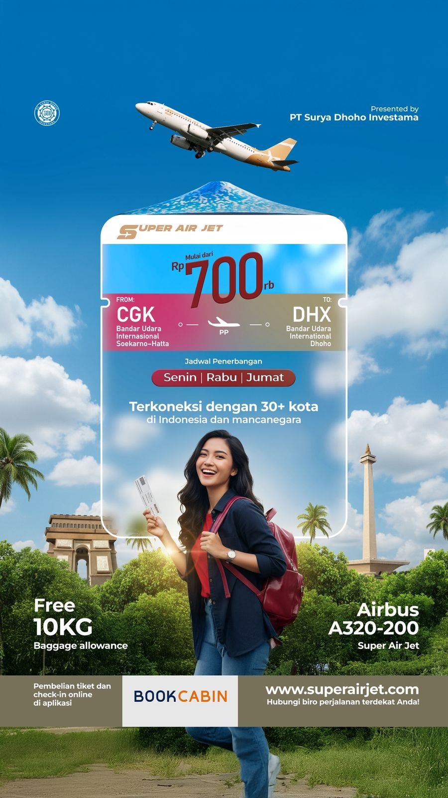 Kediri,Sekilasmedia.com-Maskapai Super Air Jet baru membuka rute super kece dari Bandara Soekarno Hatta (CGK) langsung ke Bandara Dhoho Kediri (DHX) dengan pesawat Airbus A 320- 200. Rute ini akan terbang perdana pada 10 November 2025.