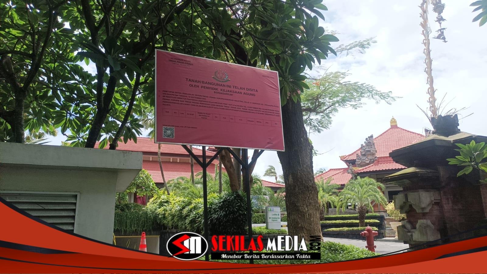 Pada plang itu tertera, bahwa tanah dan bangunan telah disita oleh penyidik Kejaksaan Agung berdasarkan: penetapan Ketua Pengadilan Negeri tindak pidana korupsi/hubungan industrial kelas 1A Denpasar No 2 Khusus Pen Pid Sus TPK/2024/PN Dps tanggal 12 September 2024.