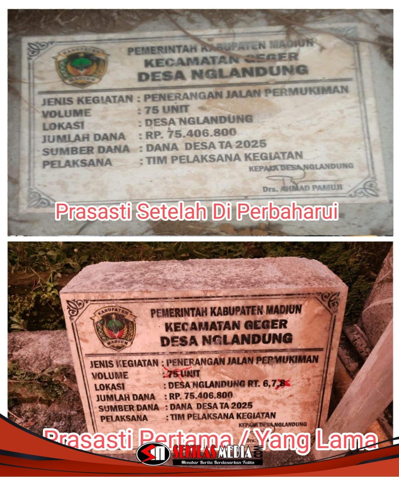 Mengetahui ada aksi pencoretan, kemudian prasasti dibongkar oleh Perangkat Desa Nglandung dan diganti dengan prasasti baru dengan perubahan redaksi tanpa ada titik lokasi pekerjaan. Dan prasasti lama yang semula dipasang di batas RT 7 dan RT 8, saat ini dipasang di dekat Kantor Desa.