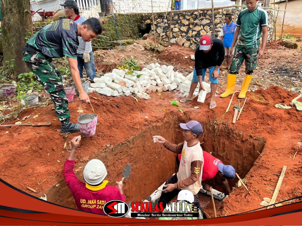 Satgas TMMD, Sertu Wahyu, bersama warga setempat melaksanakan pemasangan batu bata pada bagian dalam septictank, foto Trisno