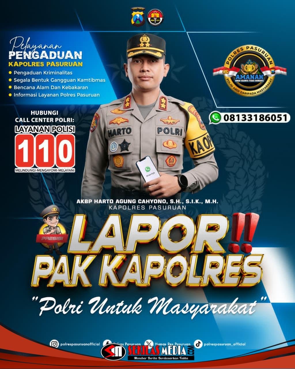 Kapolres Pasuruan, AKBP Harto Agung Cahyono, menegaskan bahwa masyarakat dapat memanfaatkan layanan tersebut untuk berbagai kejadian yang membutuhkan penanganan segera.